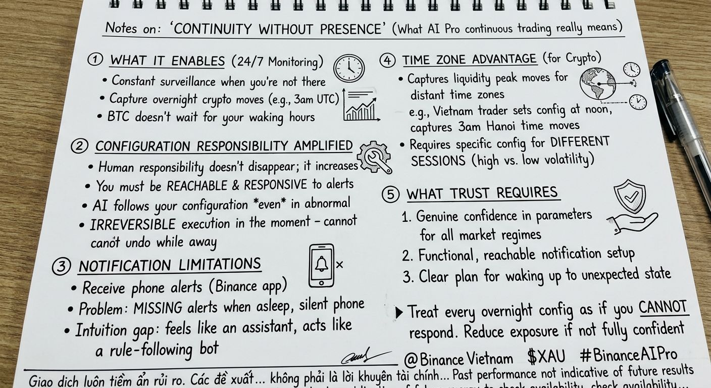 Continuous presence doesn't eliminate the human responsibility for the strategy. It amplifies it. When you're present in a trade, you can override bad configuration in real-time. If market conditions shift and your strategy parameters no longer make sense, you can exit manually. The human presence is a safety valve.