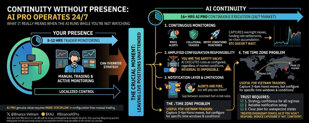 Continuous AI monitoring means a Vietnamese trader can configure a strategy to capture moves that happen at 3-4am Hanoi time and know the execution layer is active during that window. The strategy captures the opportunity; the trader reviews the results in the morning.