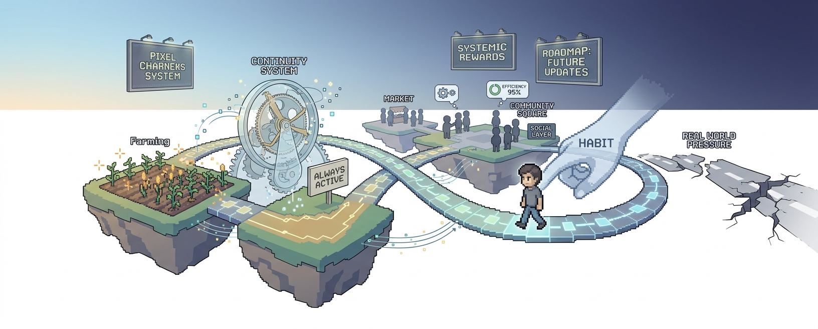 At first glance, it looks simple. Farming, collecting, interacting. But the more I sit with it, the more I feel like the loop isn’t built around actions alone. It’s built around continuity. The system seems designed to make absence feel like a break in something ongoing, not just a missed session. I can’t tell if that’s intentional design or just a side effect of persistent worlds, but it creates a subtle kind of attachment.