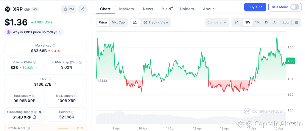 XRP trades at $1.36 as of April 15, up 1.69% in one week after bouncing from the $1.28 zone on ceasefire news.