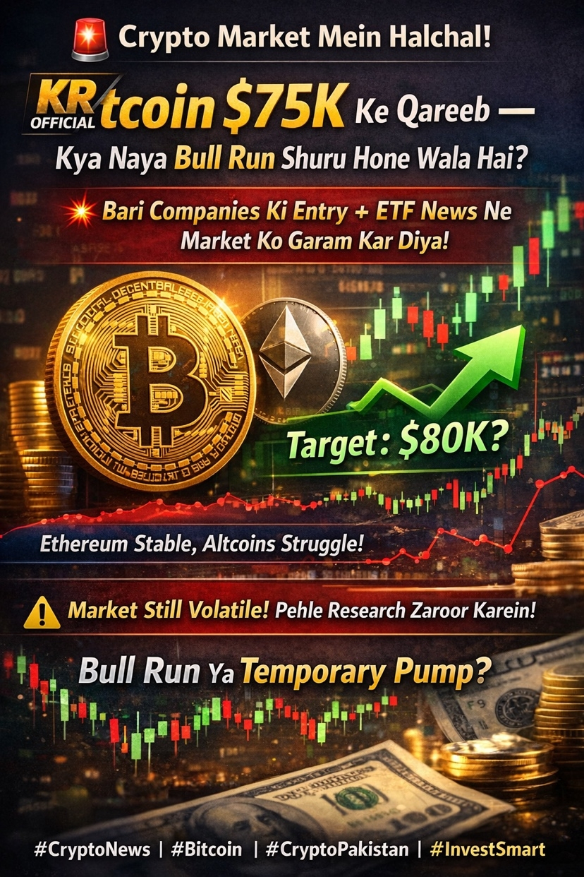 Bari companies ki entry aur ETF news ne market ko phir se garam kar diya hai. Experts ke mutabiq agar Bitcoin $75K cross karta hai to next target $80K ho sakta hai!