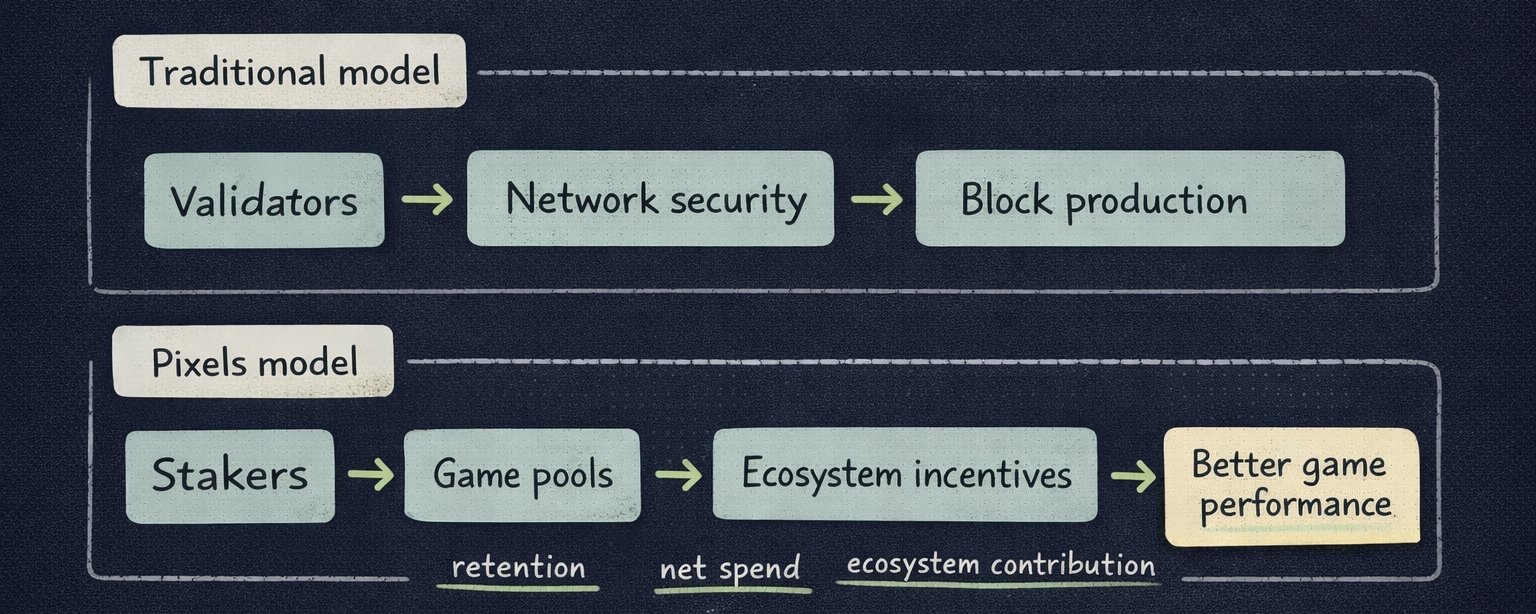 Most people still read Pixels through the usual game-token framework. A game launches, a token powers rewards, players earn, emissions flow, and the main question becomes whether the economy can survive the extraction cycle. But the more interesting shift in the new PIXEL design is that Pixels is trying to change who acts like a validator in the first place. In the staking section of the whitepaper, the project says, “One token. Many ‘validators.’ The validator is the game,” then explains that games themselves replace traditional validators while stakers help determine which games receive resources and incentives from the Pixels ecosystem.