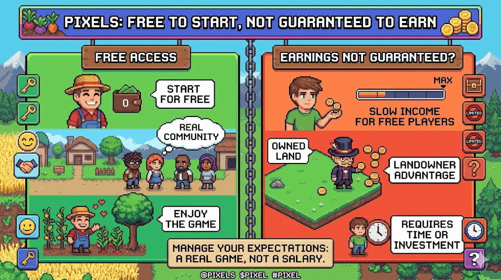 Trong Pixels, thu nhập phụ thuộc nhiều vào tài sản bạn nắm giữ và cách bạn tham gia. Người có đất trên Ronin có lợi thế rõ ràng vì họ có thể hưởng lợi từ hoạt động của người khác trên mảnh đất đó. Người chơi bình thường vẫn kiếm được nhưng tốc độ chậm hơn và trần lợi nhuận thấp hơn. Đây không phải lỗi hệ thống mà là cách nó được thiết kế.