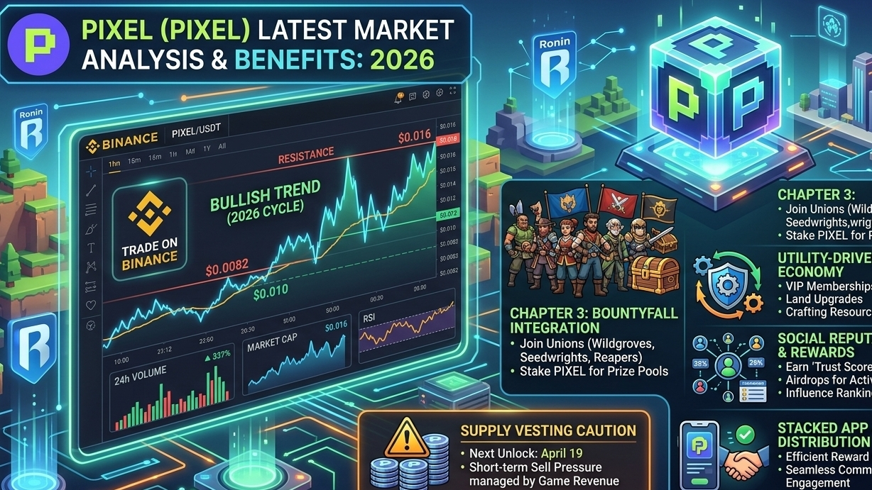 $PIXEL As of April 2026, @Pixels Pixels (PIXEL) has transitioned from a speculative gaming token into a "Social-Fi" titan within the Ronin ecosystem. Currently trading on Binance around $0.0082, the token is navigating a high-volume phase. While it faces short-term resistance near $0.016, its macro outlook remains cautiously bullish due to the rollout of Chapter 3: Bountyfall.