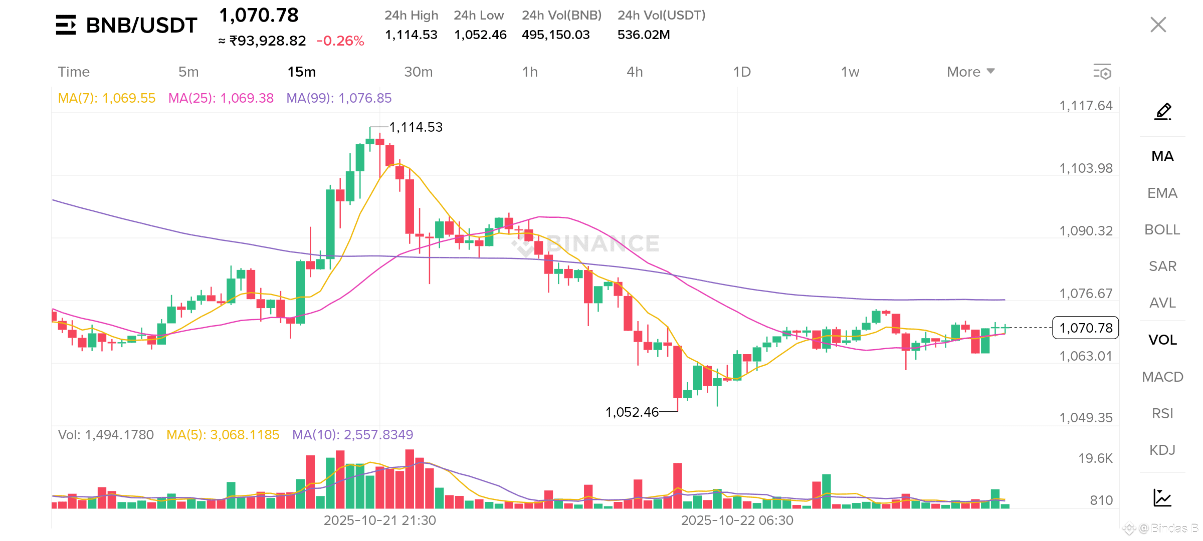 The BNB/USDT pair has experienced significant volatility over the last 24 hours, trading between a high of $1,114.53 and a low of $1,052.46. After a sharp sell-off from the peak, the price has entered a period of tight consolidation and is currently trading at $1,070.78.