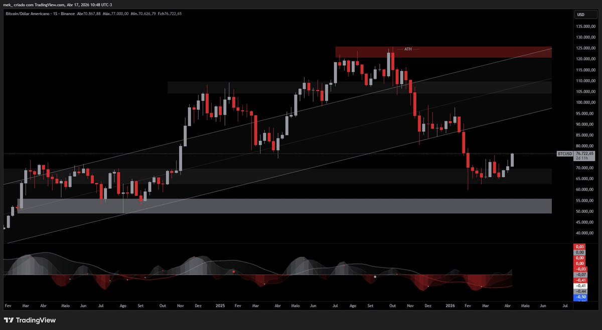 The two-week U.S.-Iran ceasefire expires on Tuesday, April 21. If it extends, oil stays suppressed and the rally continues. If it breaks, oil spikes and $BTC likely retests $72-73K, which would now function as support rather than resistance.