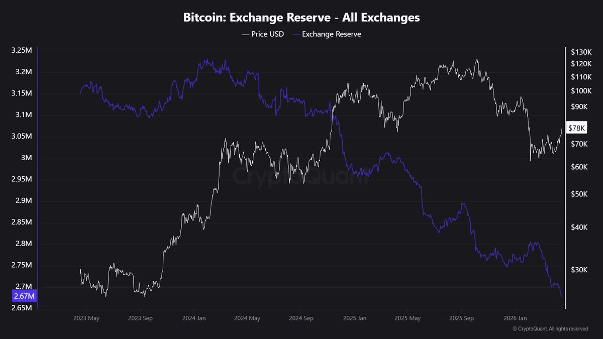 If the market were genuinely capitulating, coins would flow onto exchanges for liquidation, not off them. Panic requires sellers. Sellers require exchanges. The opposite happened.