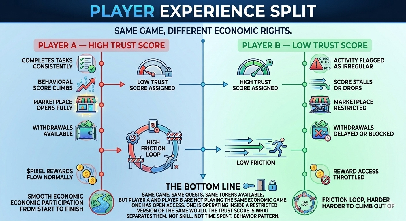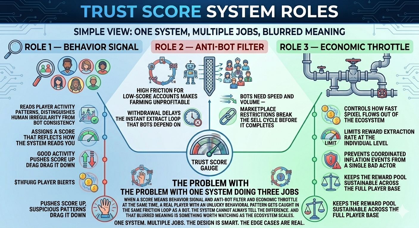 the trust score is one output of that. it’s the behavioral signal layer that sits underneath everything else. before a player can access the full economic stack marketplace, withdrawals, $PIXEL rewards the system has already been reading their activity patterns. how they move, when they act, what they do between sessions. not to spy. to distinguish.