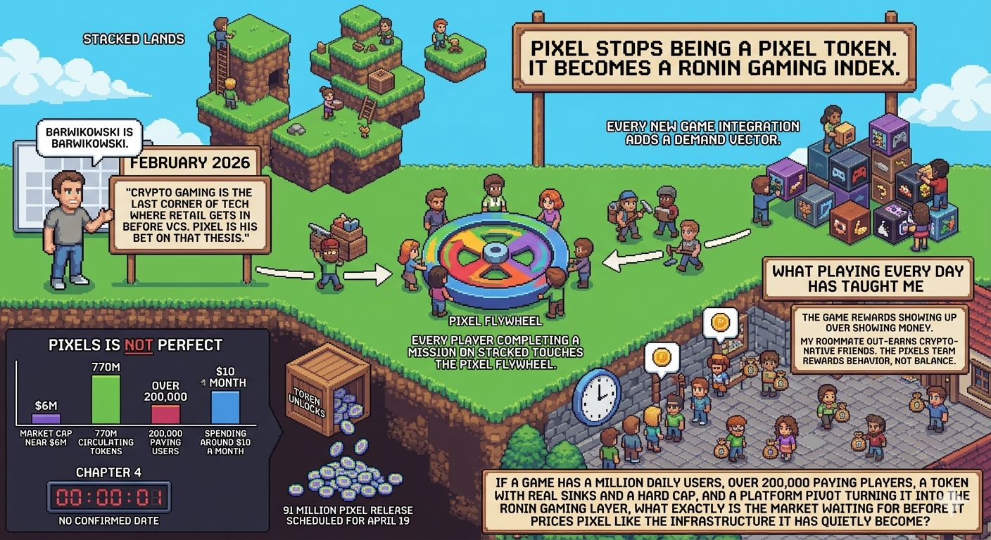 If Stacked lands, PIXEL stops being a Pixels token. It becomes a Ronin gaming index. Every new game integration adds a demand vector. Every player completing a mission on Stacked touches the PIXEL flywheel. In February 2026, Barwikowski argued crypto gaming is the last corner of tech where retail gets in before VCs, because AI rounds are locked to institutional money. PIXEL is his bet on that thesis, and I am along for the ride.