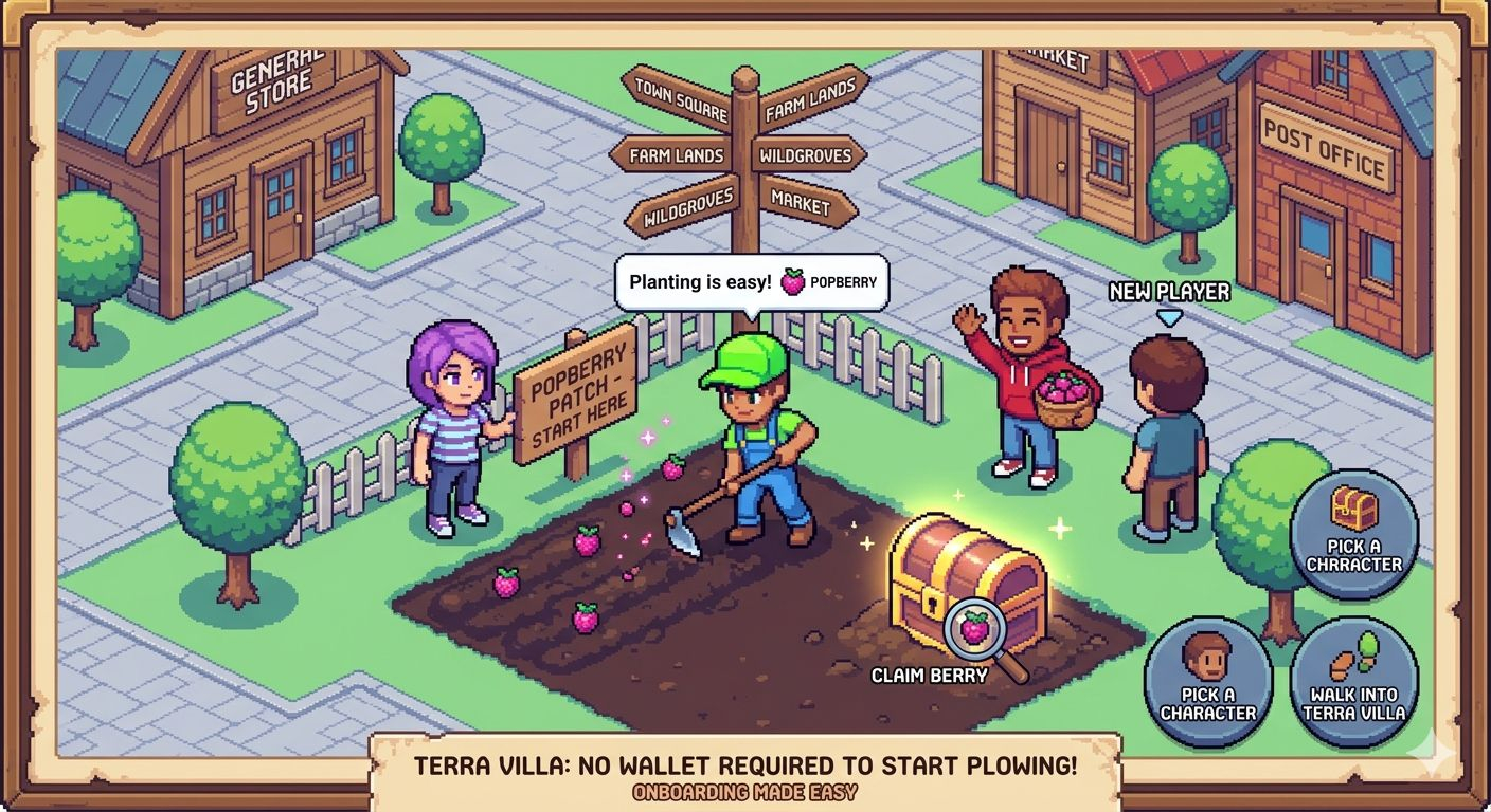 Most Web3 games throw you into a wallet screen before you know what the game even does. Pixels does the opposite. You pick a character, you walk into Terra Villa, and you start planting Popberries. No seed phrase. No gas fees. No "connect wallet to continue" popup. I brought my non-crypto roommate into the game last summer as a test. She played for three weeks before she asked me what BERRY actually was.