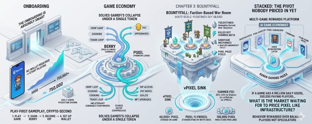 In my view, this is the whole bull case right there. Pixels solved the Web3 onboarding problem by hiding the Web3. You earn BERRY in-game as a normal currency. When you want to pull it on-chain, you grab a VIP membership paid in PIXEL or WRON, and the wallet setup happens then. The game funnels real gamers into crypto, not the other way around. Over one million daily active wallets came out of this one design choice. Sky Mavis told Coindesk Pixels went from around 3,000 daily users on Polygon to peaks of 750,000 after the Ronin migration, before crossing one million. The growth came from players, not speculators.