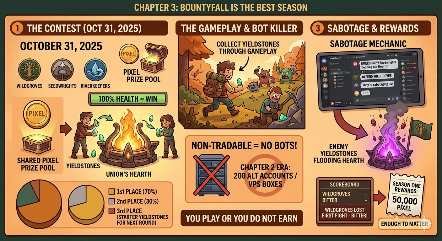 Here is the part I love. You collect Yieldstones through regular gameplay, not by spending money. They are non-tradable, which killed the bot farming meta overnight. Remember the Chapter 2 era, when people ran 200 alt accounts on cheap VPS boxes? Gone. You play or you do not earn. The sabotage mechanic turned my Discord into a war room. My Union had an emergency voice call during the first season when Seedwrights flooded our Hearth with enemy Yieldstones. We lost the fight. I have been bitter about Seedwrights ever since. Petty, I know. Season One capped rewards at 50,000 PIXEL. Not life-changing money, but enough to matter if you showed up.