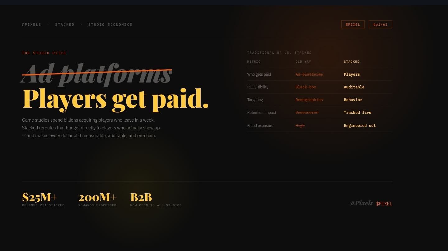for $PIXEL specifically, this matters because Stacked is now opening to external studios. every new studio that builds on the system is a new demand surface for the token. the more games run rewards through Stacked, the more utility $PIXEL has outside the Pixels ecosystem itself. that's a token utility expansion story that doesn't depend on any single game succeeding -- it depends on the infrastructure being good enough that studios choose to build on it.