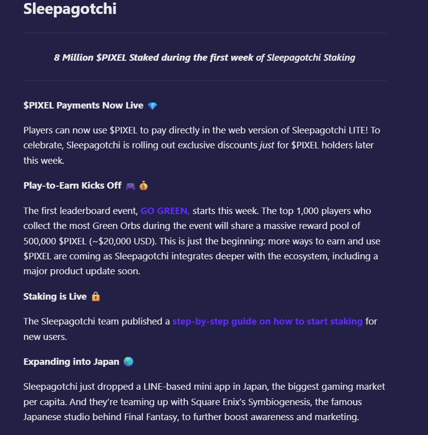 Sleepagotchi just hit 8 million PIXEL staked in its very first week.