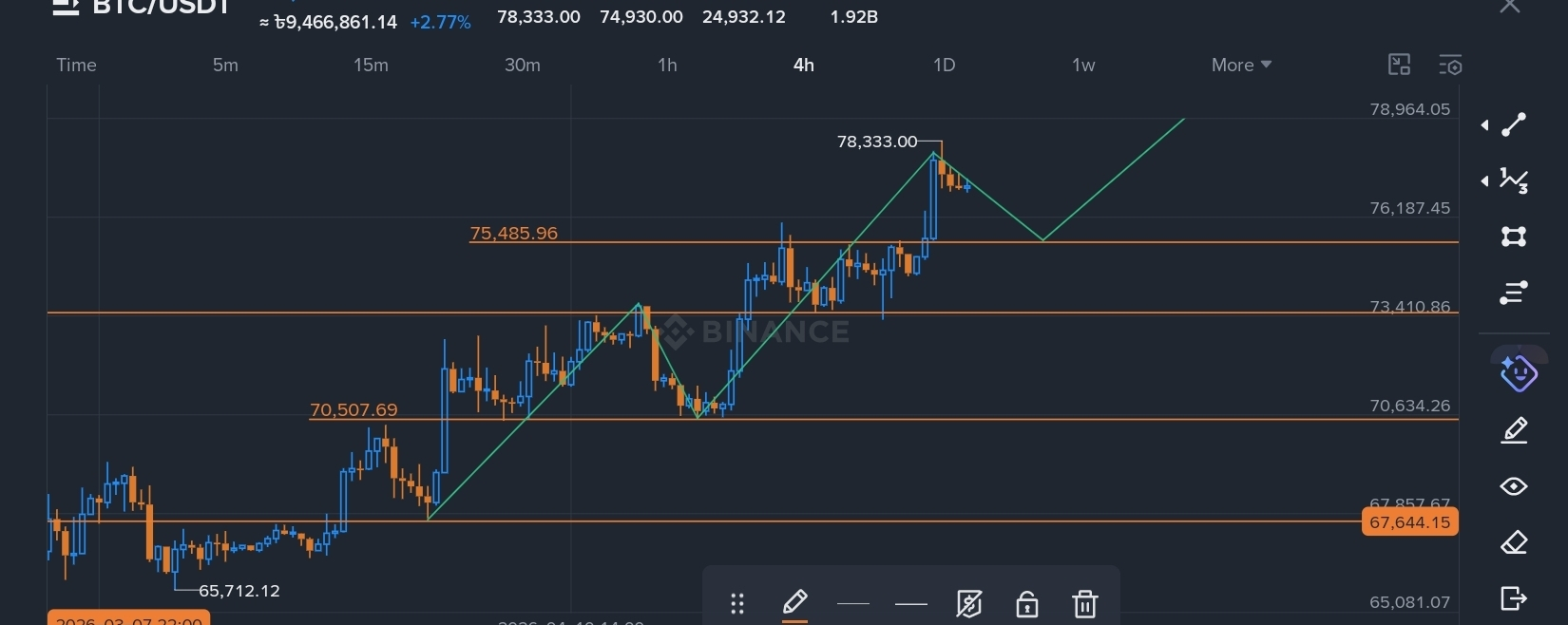If buyers maintain control and the price respects the trendline, BTC could continue its upward momentum and possibly target new highs above 78,000.