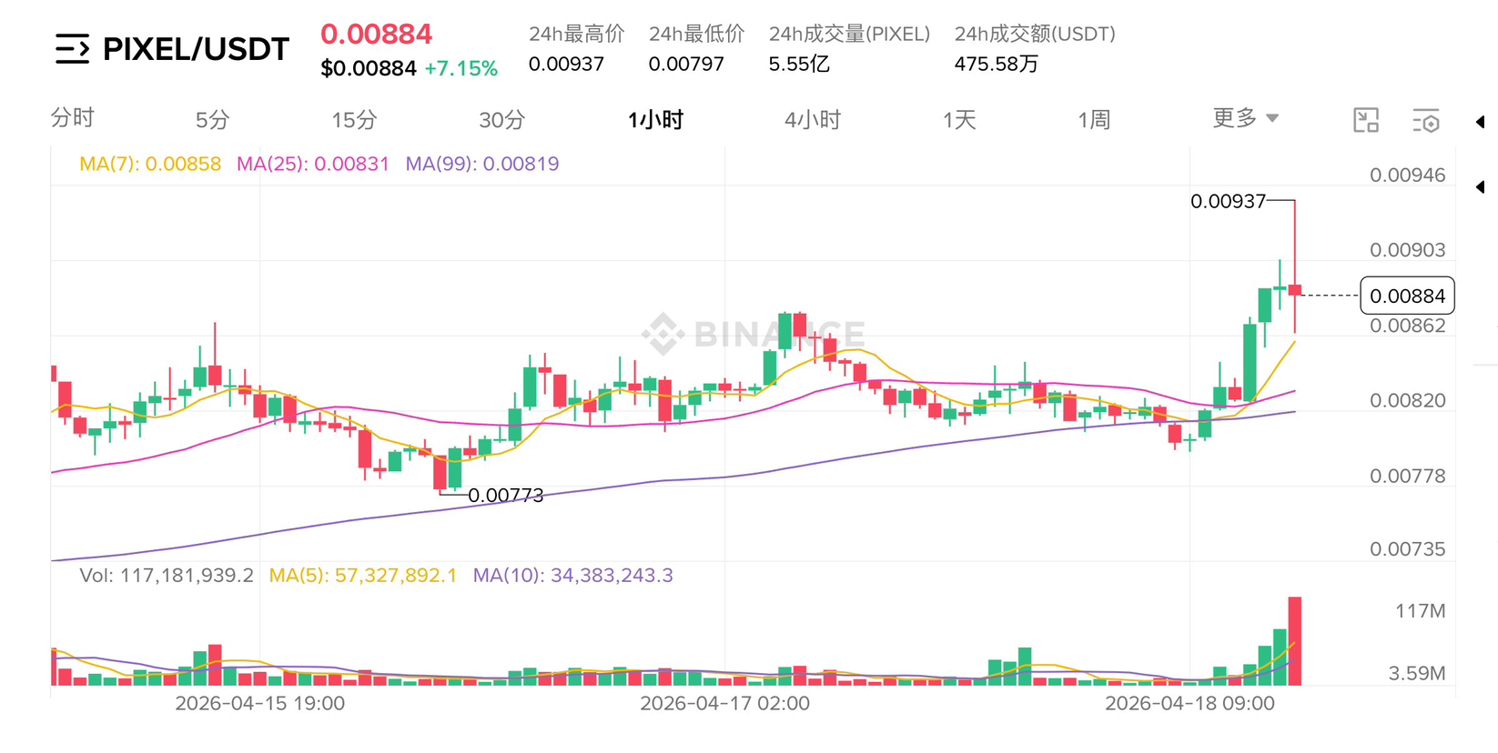 $PIXEL Currently reported at $0.00884, with a 24-hour increase of +7.15%, a 24h high of $0.00937, and a low of $0.00797, with a trading volume of 555 million PIXEL and a transaction value of 4.7558 million USDT. This large bullish line is very conspicuous in structure. The moving average MA7 is reported at 0.00858, crossing above MA25's 0.00831, and MA99 is continuously rising at 0.00819. The three lines are in a bullish arrangement; from the low point of $0.00773, this round of increase has exceeded 14%. The rapid pullback from the high of $0.00937 indicates selling pressure above. Currently, it is resting at $0.00884, and holding above MA7 is a key level I am observing recently. This time, @Pixels' CreatorPad event total rewards neon is 15 million PIXEL, with 7.5 million PIXEL exclusive to the Chinese-speaking region, ending on April 28. Friends who want to participate have limited time left. Real-person research and prioritizing survival; today's bullish line is not a reason for me to change my judgment. My judgment is based on business logic, not on single-day increases; these two things are not on the same dimension.