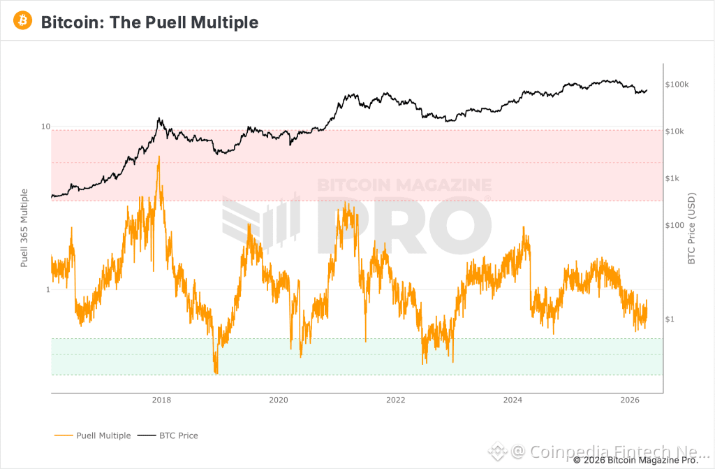 The Puell Multiple remains in a relatively low range, reflecting that miner revenues are not elevated compared to historical averages. This indicates that miners are not under strong financial pressure to sell aggressively, which helps limit downside risk.