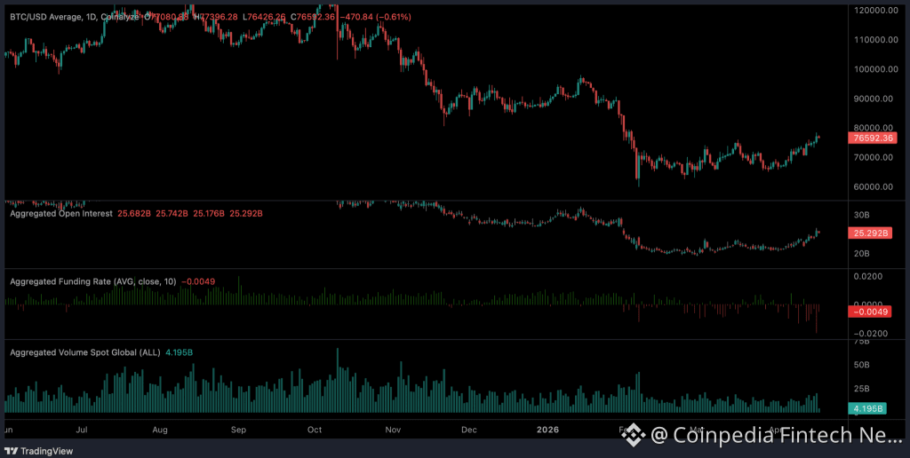 The Bitcoin (BTC) price has been displaying significant strength in the past few days and marked monthly highs above $78,000. Currently, the price is experiencing significant upward pressure as it plunges below $76,500. The underlying data presents a more complex picture than the price action suggests, as the on-chain and derivatives signals reveal the token being in a transition phase.