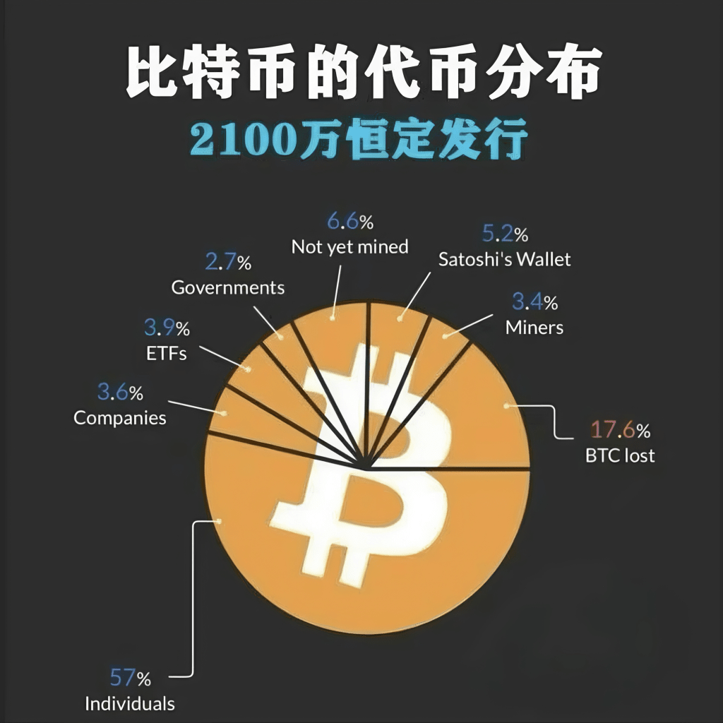 A set of the latest Bitcoin token distribution data is redefining the market's perception of this digital asset: 57% held by individuals, 17.6% permanently lost, 6.6% not yet mined, and the remaining shares are dispersed among Satoshi's wallet, spot ETFs, companies, miners, and governments. This highly decentralized holding structure supports the claim that 'Bitcoin is the most decentralized product' and has sparked heated discussions about 'can it surpass gold to become the highest valued asset globally.'