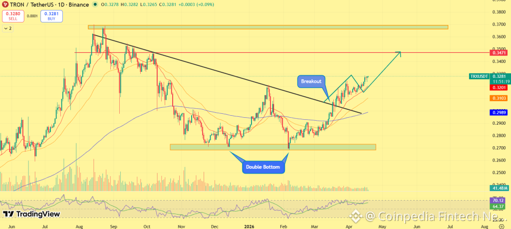TRON is holding a bullish structure after confirming a breakout above its descending resistance, with price now sustaining above key levels. Following the breakout, TRX price continues to trade steadily above the $0.30 zone, forming consistent higher lows rather than sharp volatility. This controlled price action reflects ongoing accumulation, with buyers maintaining strength across sessions.
