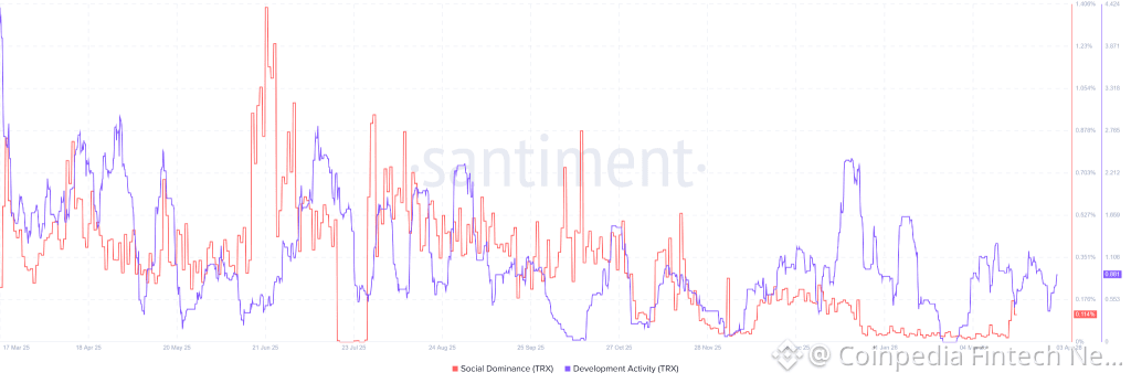 At the same time, development activity remains stable, while social dominance has cooled, indicating reduced speculative noise. This combination reflects a low-hype, high-utility environment, where demand is driven by actual usage rather than short-term sentiment. Such conditions typically support price stability and accumulation phases.