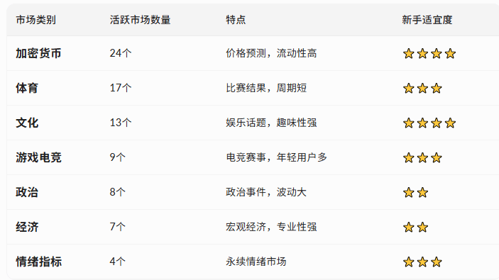 Diversified Markets: Covers 7 major categories including cryptocurrencies, sports, politics, and economics