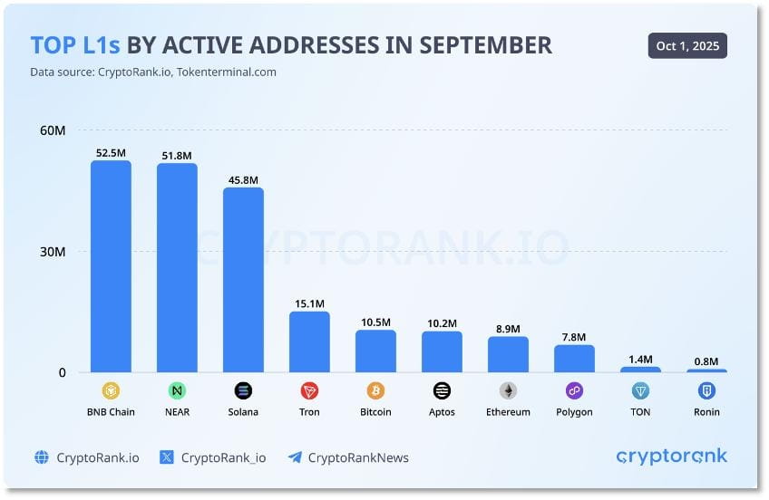 In September, BNBChain's active addresses exceeded 52.5 million, ranking first among mainstream chains.