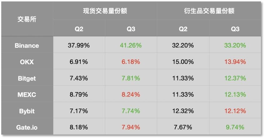 Whether in spot or derivatives, Binance's market share in Q3 holds an absolute leading advantage, and both have increased compared to Q2.