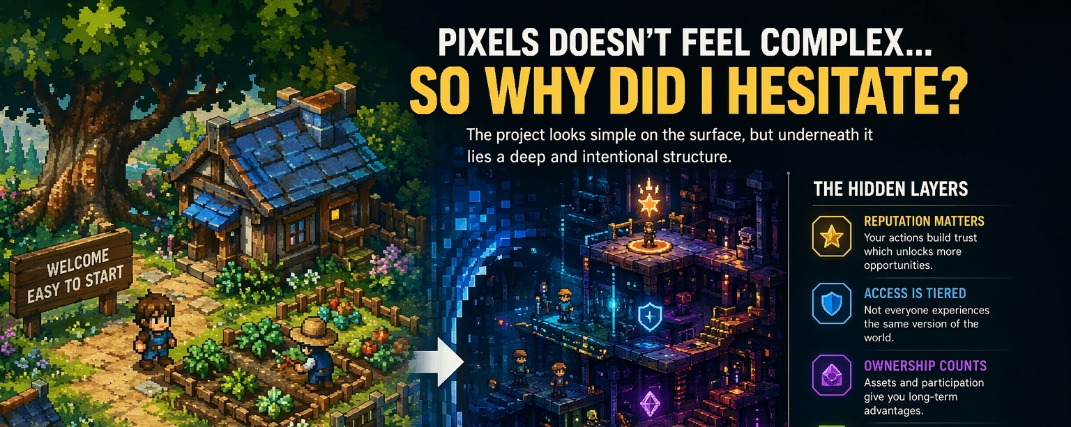 Most projects either over-explain themselves and kill the magic, or under-design themselves and hope charm can carry the weight. Pixels does neither. It lets charm open the door, then trusts the structure to keep working on you after you’re inside.