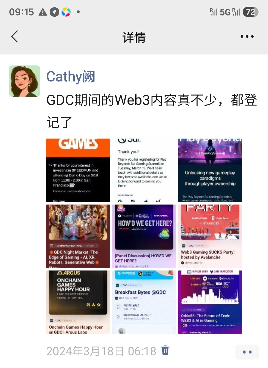 Compared to 2024, at GDC, there are existing Web3 game startups like Metacene showcasing, Avalanche's public chain presenting its ecosystem's Shrapnel chain games collectively, Solana/Sui renting an entire floor near the exhibition hall to hold their all-day side events, and South Korea's Wemade hanging large advertisements promoting their Night Crow and contributing several themed speeches on Web3 games. Nexon's adventure island, MapleStory Universe, is hosting a party in a restaurant next to the exhibition hall for promotion, while the Blockchain Game Alliance (BGA) is holding a breakfast meeting for chain games, and a16z is hosting their Speedrun incubator project demo selection during the 2024 GDC. Even PolkaDot held a seminar during this GDC... There are so many events that Sister Cathy’s registration for Web3 activities in 2024 cannot fit in a 3x3 grid.
