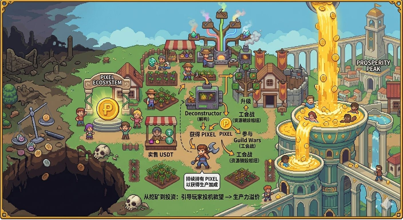 Now: Player output -> Must go through Deconstructor (解构) or upgrade tools -> Participate in Guild Wars (工会战) -> Continuously hold PIXEL to gain production bonuses. Through T5 and the upcoming Chapter 2 rules, Pixels have guided players' speculative desires toward productivity premiums. What players invest in the game is no longer just simple grinding time, but rather continuously consolidating for better returns.