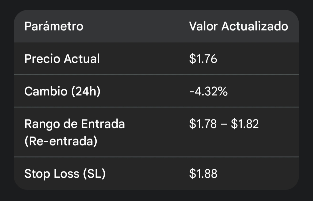 ⚪ Currently, the asset is trading at $1.76, situated below the 20-period moving average on the 4H timeframe, which increases the probability of seeking the MA99 (99-period Moving Average) that acts as the next important liquidity magnet.