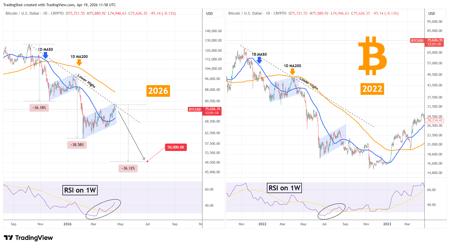 The strongest of those is that it is currently in a Bear Flag pattern (Channel Up) that is not only similar to the Nov 2025 - Jan 2026 but also identical to those of 2022 (Jan-March and June-Aug). Both below their respective 1D MA200 and Lower Highs trend-lines. At the same time, the 1W RSI is on a similar post oversold rebound as August 15 2022.