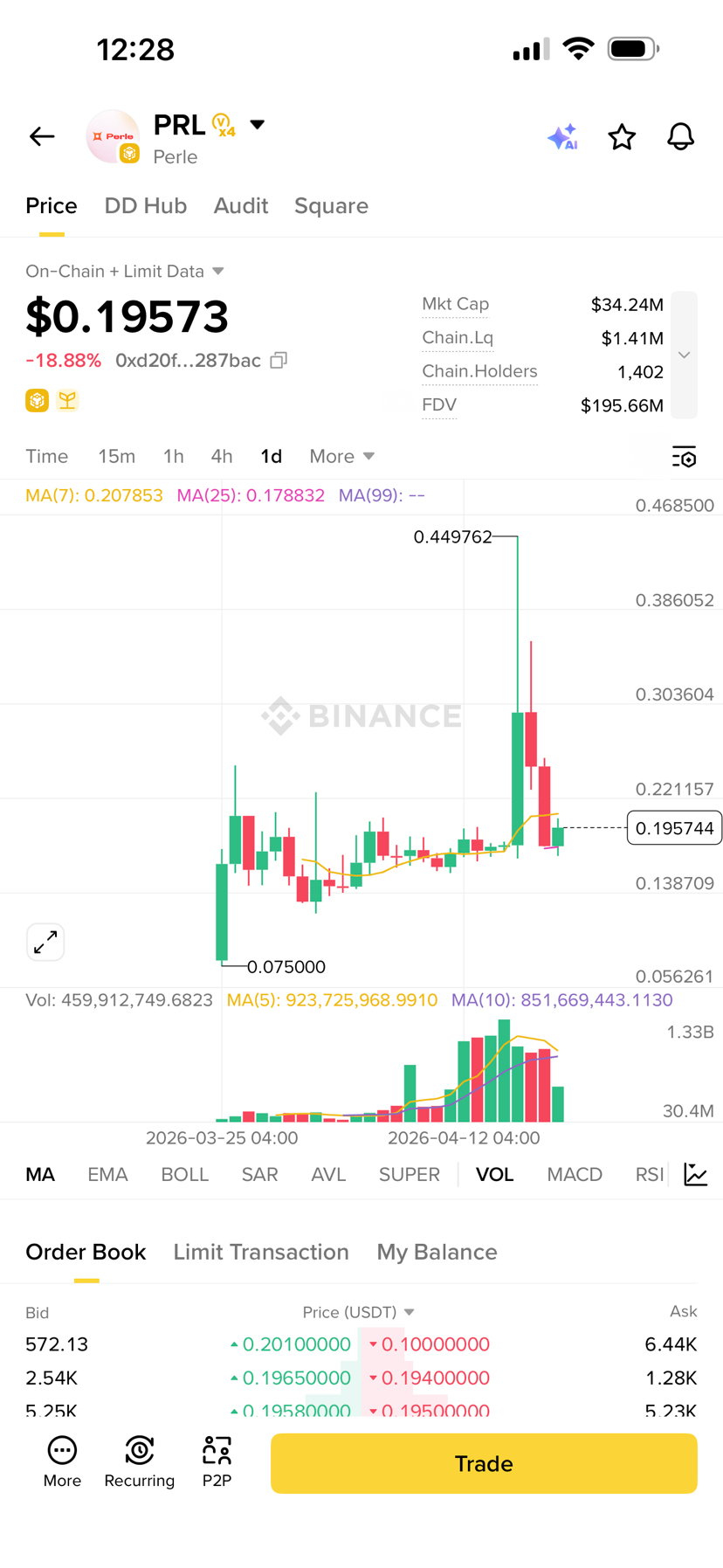 The recent price action of$PRL (Perle) has captured the attention of traders and market observers due to its sharp volatility and rapid movement within a short timeframe. After reaching a high near the $0.44 level, the asset experienced a significant correction, dropping to around $0.19, marking a decline of nearly 19% in a single day. Such movements are not uncommon in the cryptocurrency market, where liquidity conditions, speculative interest, and broader sentiment can quickly shift momentum. The chart suggests that PRL initially gained traction through a strong bullish push, likely driven by increased buying pressure and rising volume. However, the subsequent rejection at higher levels indicates that sellers stepped in aggressively, leading to profit-taking and a cooling-off phase. Despite this pullback, trading volume remains elevated, which is often a sign that the asset is still under active accumulation or distribution. Market capitalization currently stands in the mid-range tier, while the number of holders suggests a growing but still relatively concentrated community. These factors combined highlight that PRL is in a transitional phase, where its next direction will likely depend on whether buyers can maintain support levels and rebuild upward momentum.