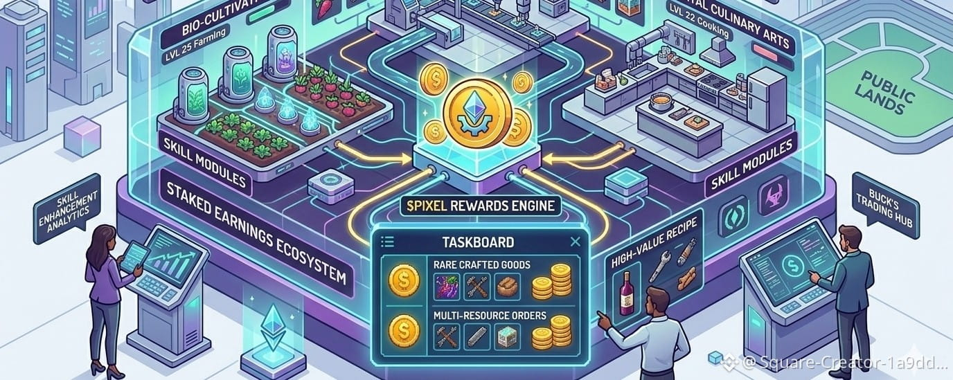 The secret to increasing your share of $PIXEL lies in "skill diversification." When you level up in skills like carpentry, cooking, and farming simultaneously, you unlock complex tasks on the taskboard. These tasks don't require simple raw materials, but rather products that require multiple stages of manufacturing, and this is where the real profits and huge rewards lie.
