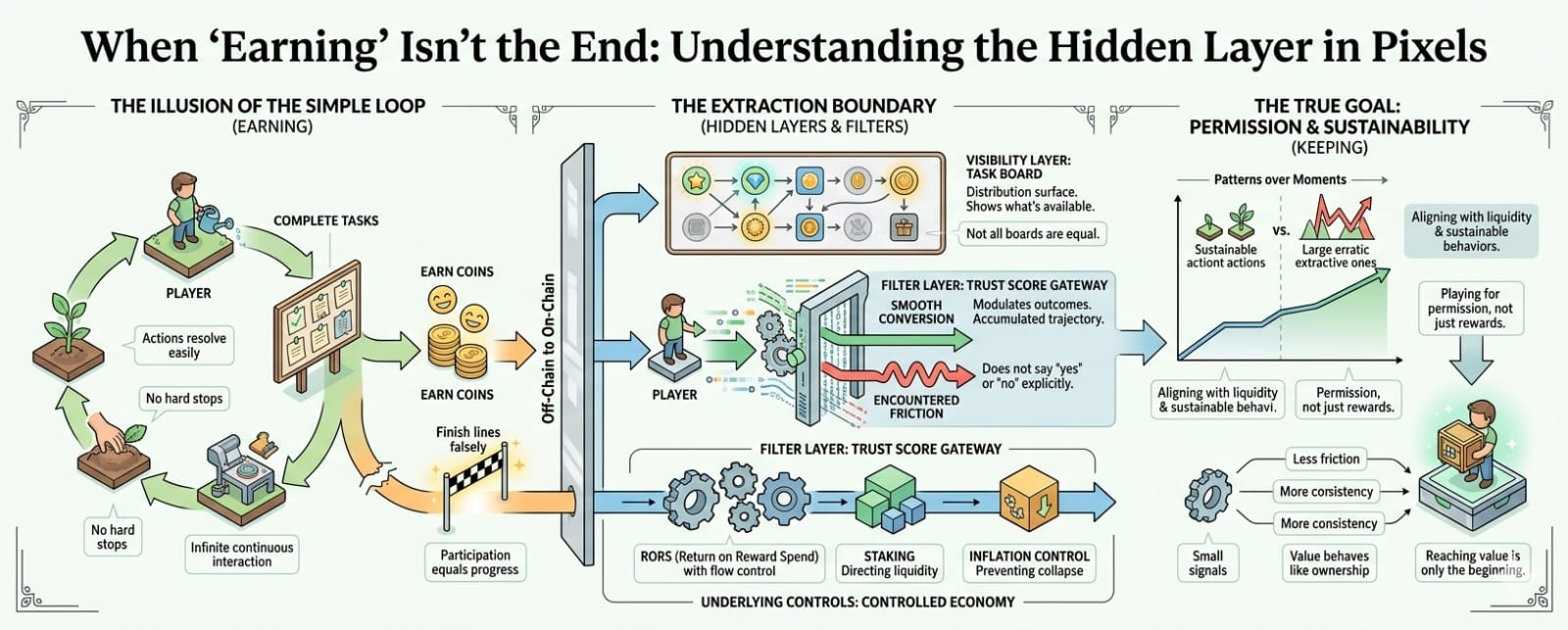 Inside Pixels, everything is optimized for continuity. The game doesn’t interrupt you. It doesn’t question your actions. Even inefficient loops continue running. Even low-value production still “works.” You can stay active indefinitely, and the system will keep responding.