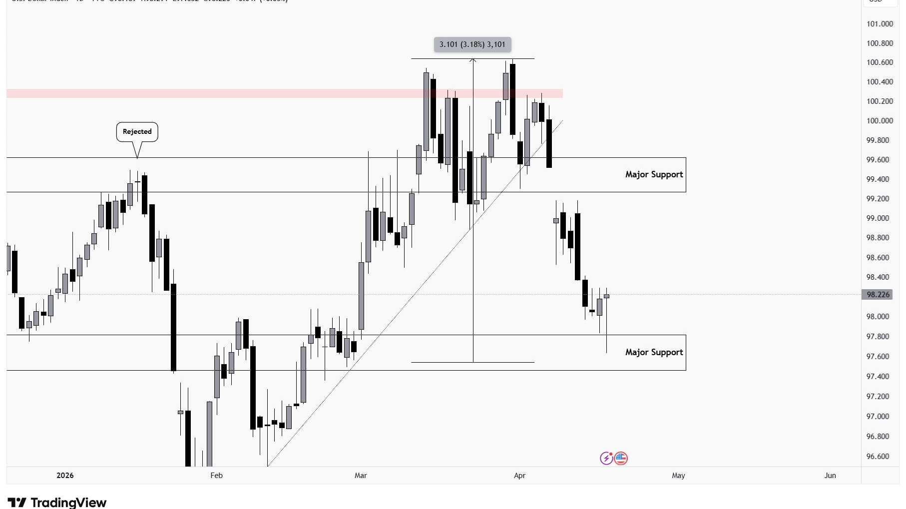 #DXY kept dropping and finally tapped into the major support zone as per the call. A rejection wick again indicates the same thing, but looking at the structure, it is bearish, so sentiments are mixed. Going long can be risky, so add extra confirmation before doing anything.