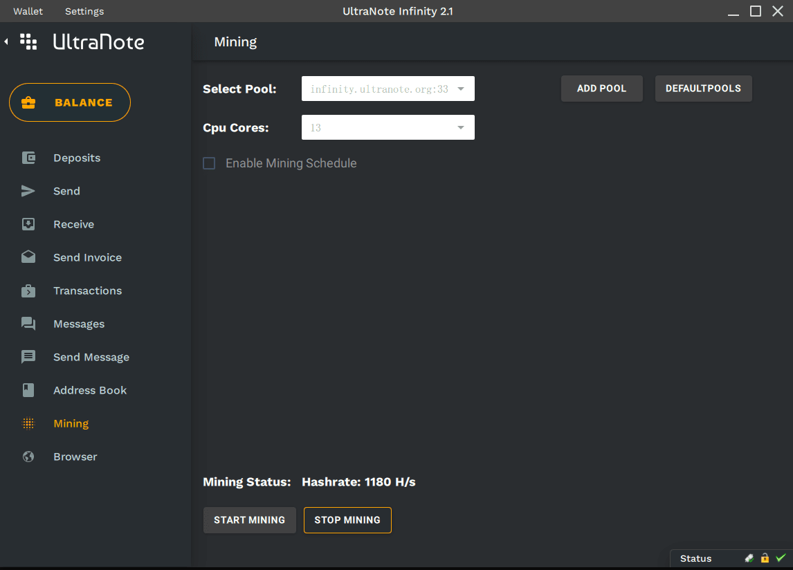 - Mining: CPU / GPU friendly, ASIC resistant algorithm; wallet starts with a built-in miner.
