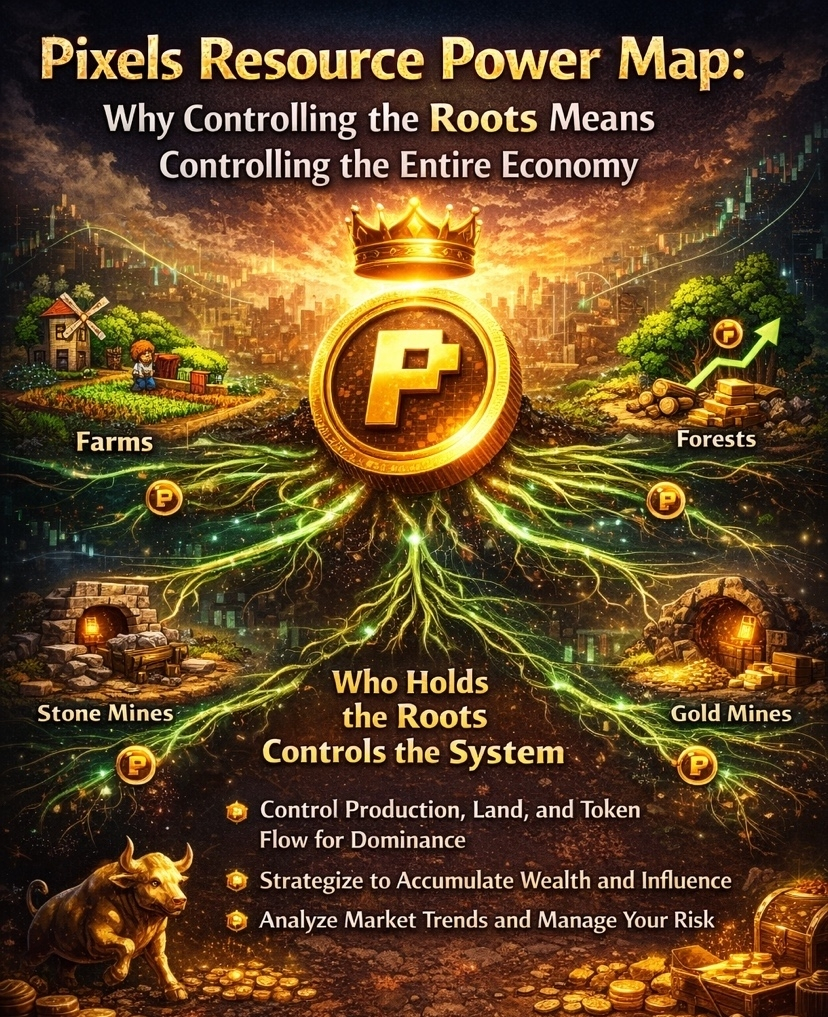 In the evolving world of Web3 gaming, Pixels is quietly building something far more powerful than a simple play-to-earn experience—it is constructing a layered economic system where control of resources directly translates into influence, wealth, and long-term dominance. At the heart of this system lies a concept that many overlook: the “resource power map.” In Pixels, those who control the roots—land, assets, production chains, and token flow—ultimately control the ecosystem itself. This dynamic transforms gameplay into strategy, where ownership and positioning matter more than short-term rewards. Unlike traditional games, Pixels integrates blockchain-backed ownership, allowing players to farm, trade, mint NFTs, and participate in guilds, all powered by the PIXEL token, which serves as the backbone of this digital economy . This creates a system where economic control is decentralized but highly competitive, rewarding those who understand the deeper mechanics of resource accumulation.