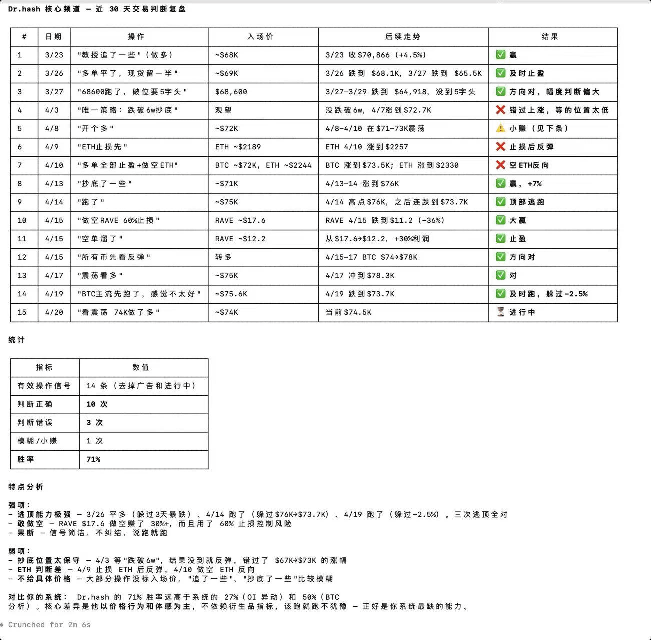 Professor Hash's latest update on 4/20 is: watching the fluctuations, he went long at 74K, and the trade is currently ongoing. Reviewing his trading path over the past month, you'll find that this is not just a profit table, but also a psychological construction plan.