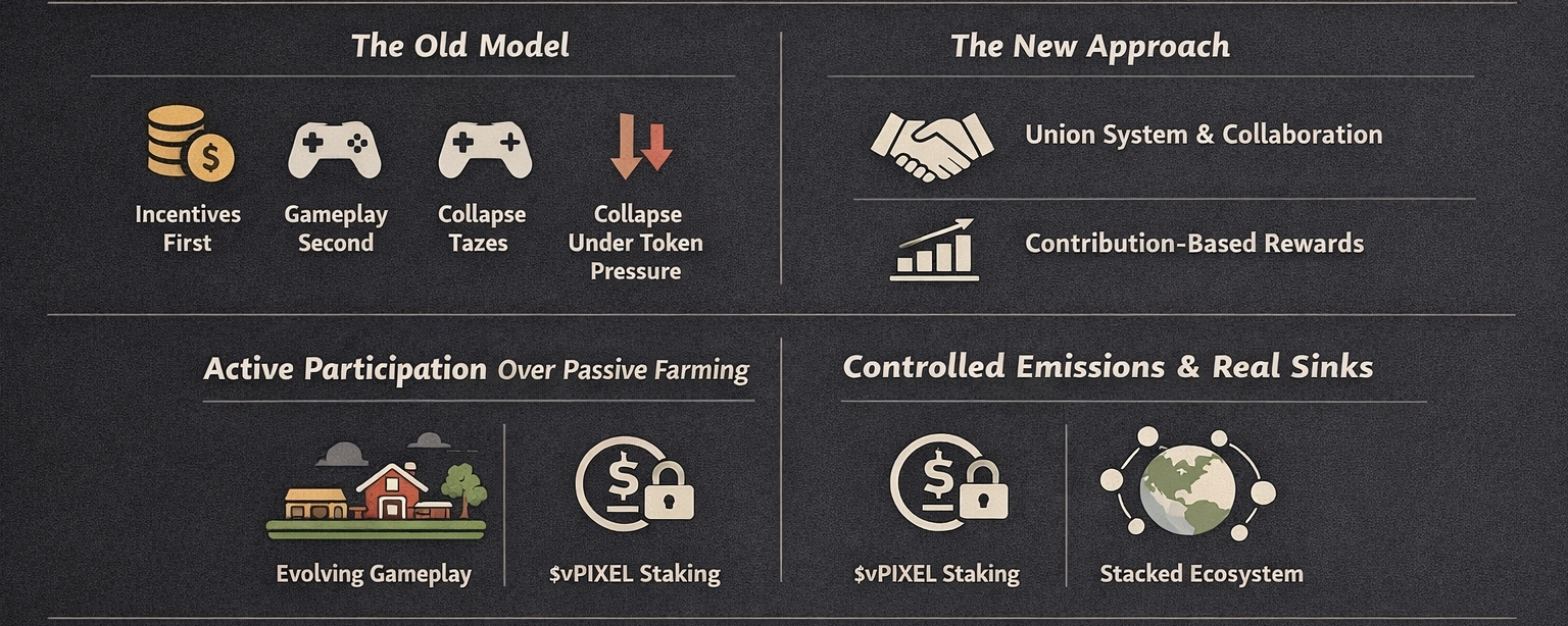 For years, most blockchain games followed the same fragile loop. Incentives came first, gameplay came second, and everything eventually collapsed under its own token pressure. What makes @Pixels different today is not just that it learned from that phase, but that it actively redesigned itself around sustainability instead of short-term attraction.