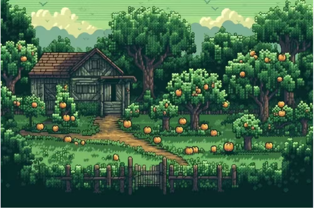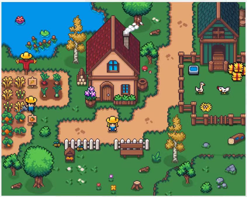 Pixels: pixel-style social farming + exploration + building, similar to (Animal Crossing + Stardew Valley), emphasizing relaxation, social interaction, and creative fun.