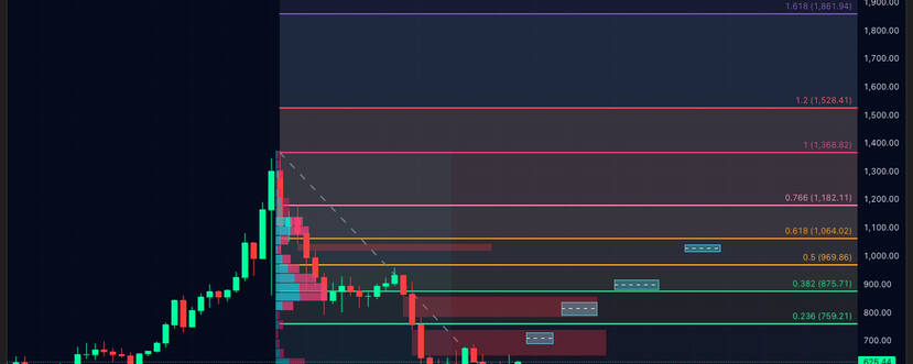 The volume profile makes this even more important. Most significant activity has taken place much higher, around the 900-1100 area, which means many traders are still trapped above the current price.