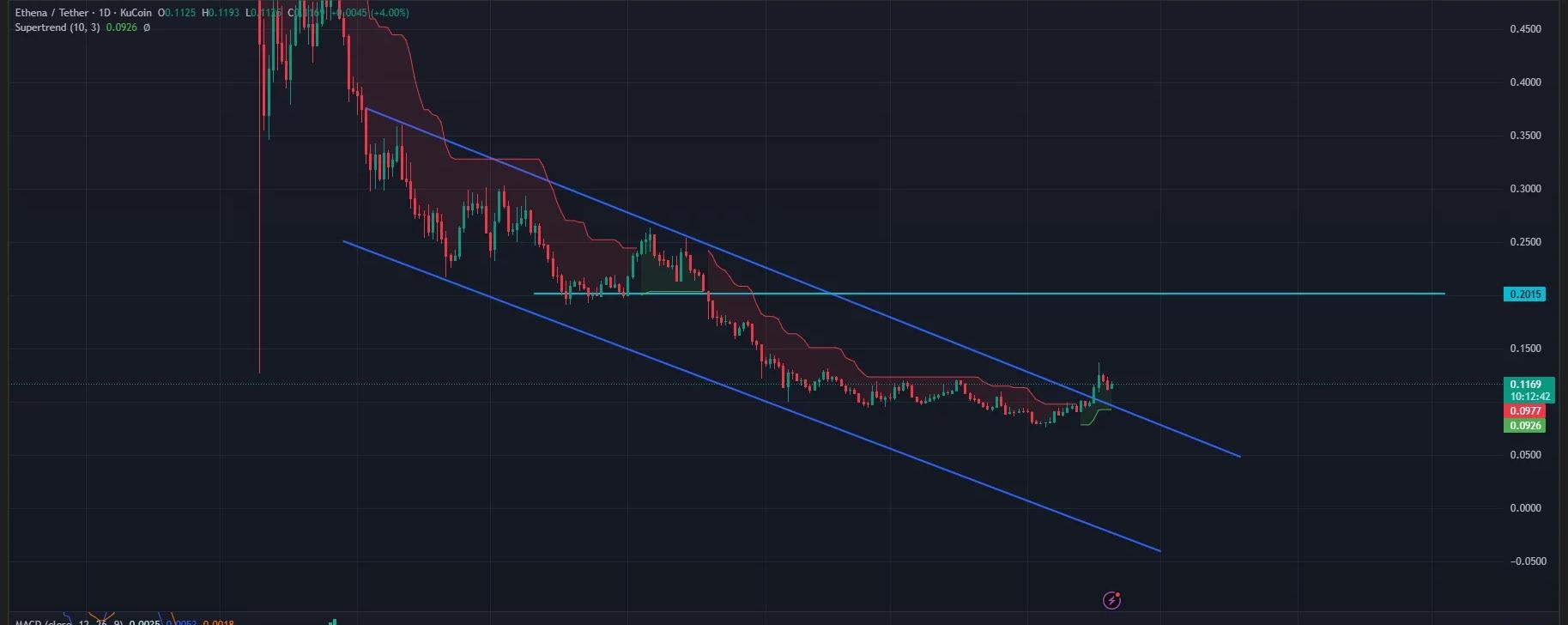 Ethena ( $ENA ) price rallied to a 10-week high of $0.134 on Saturday before settling at $0.116 at the time of writing. The token’s market cap stood at $1.02 billion with a daily trading volume of $126 million.