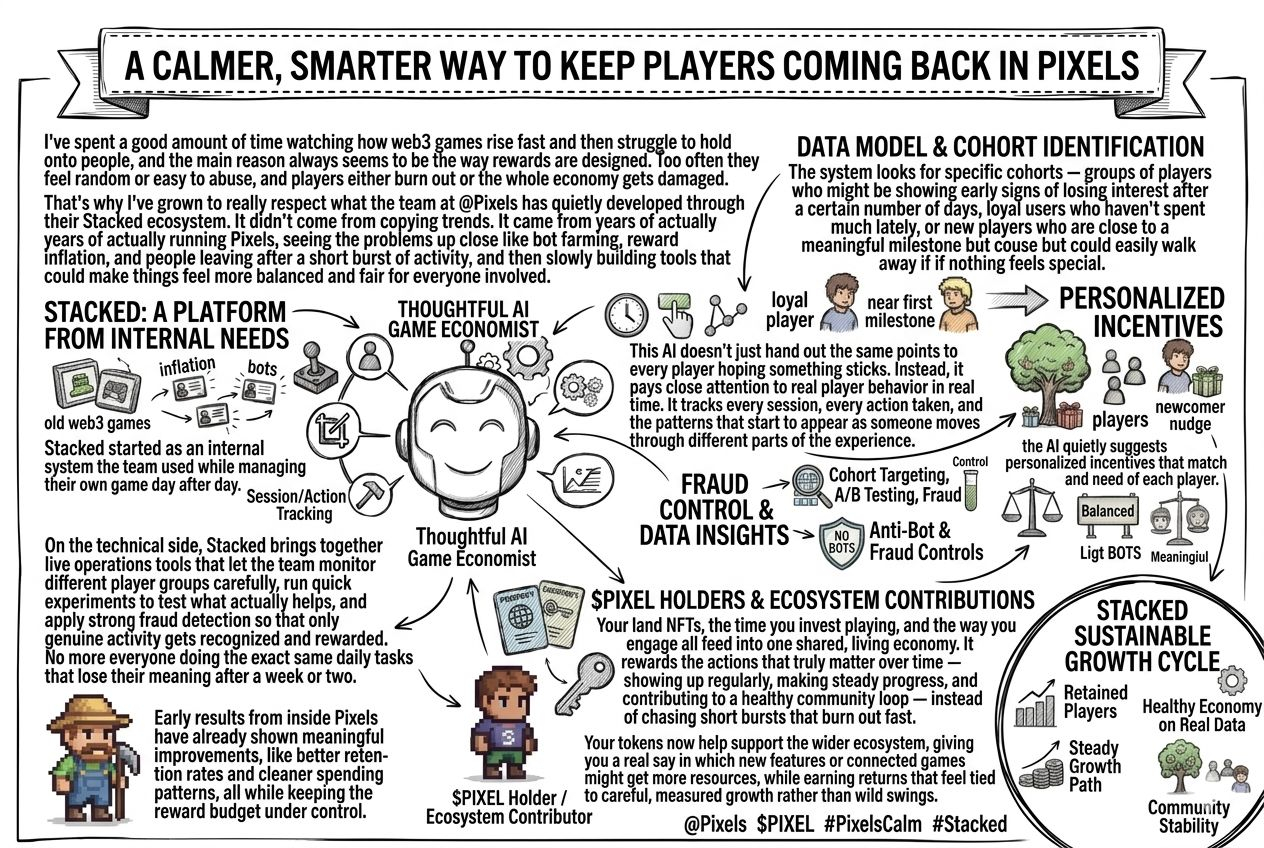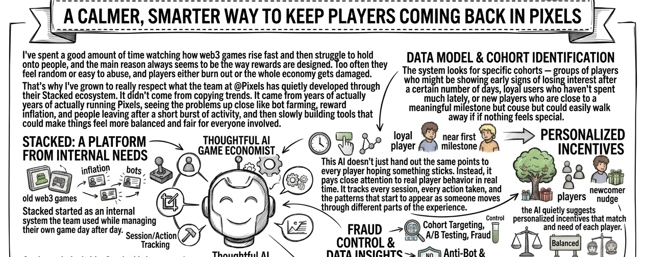 I've spent a good amount of time watching how web3 games rise fast and then struggle to hold onto people, and the main reason always seems to be the way rewards are designed. Too often they feel random or easy to abuse, and players either burn out or the whole economy gets damaged. That's why I've grown to really respect what the team at @Pixels has quietly developed through their Stacked ecosystem. It didn't come from copying trends. It came from years of actually running Pixels, seeing the problems up close like bot farming, reward inflation, and people leaving after a short burst of activity, and then slowly building tools that could make things feel more balanced and fair for everyone involved.