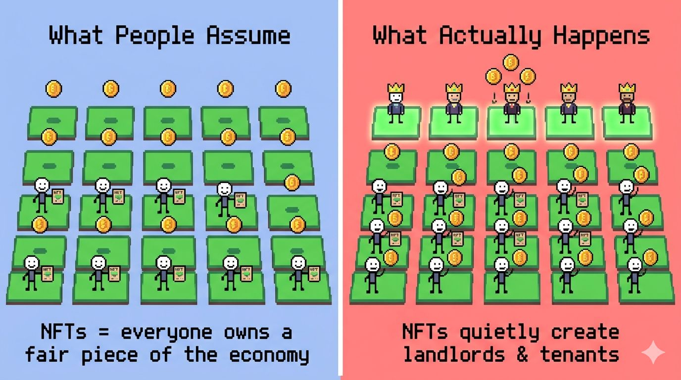 But the more I watched my own yields versus what the owned plots were pulling in, the more something uncomfortable clicked. People are looking at this completely wrong. The NFTs aren’t there to hand out equal slices of the economy to every player who shows up. What actually happens is that the limited supply of those land NFTs quietly turns their holders into the landlords of the entire system. They get the exclusive resource nodes, the yield multipliers, the ability to rent plots to the rest of us, and the little tax-like cuts from anyone farming or building on their ground. The free players—the majority—keep the fields busy, keep the resources moving, keep the activity alive. Without that constant flow from below, the owned plots don’t compound nearly as fast.