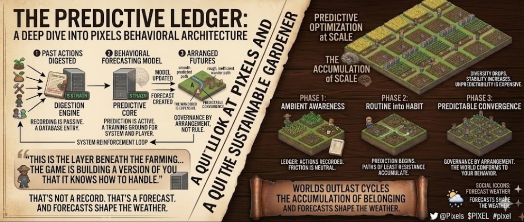 This is the layer beneath the farming. Beneath the tasks. Beneath the token. The game looks like a world. But it's also a training ground—for the player, yes, but more importantly for the system that's quietly learning what you'll do before you do it. Every session feeds the model. Every routine makes you more legible. Every small alignment between your behavior and the system's expectation tightens the loop a little further.