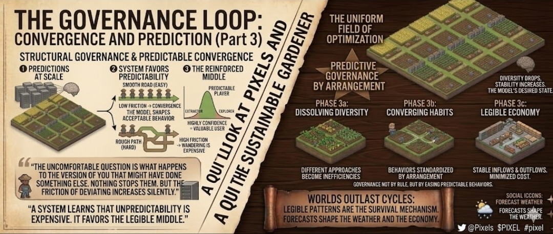 This matters because prediction, at scale, becomes a form of governance. Not governance by rule. Governance by arrangement. The system doesn't need to forbid anything. It just needs to make certain behaviors easier than others. Over time, the player base converges toward the behaviors the model can process most efficiently. Diversity drops. The world becomes more manageable but less surprising. More stable but less alive.