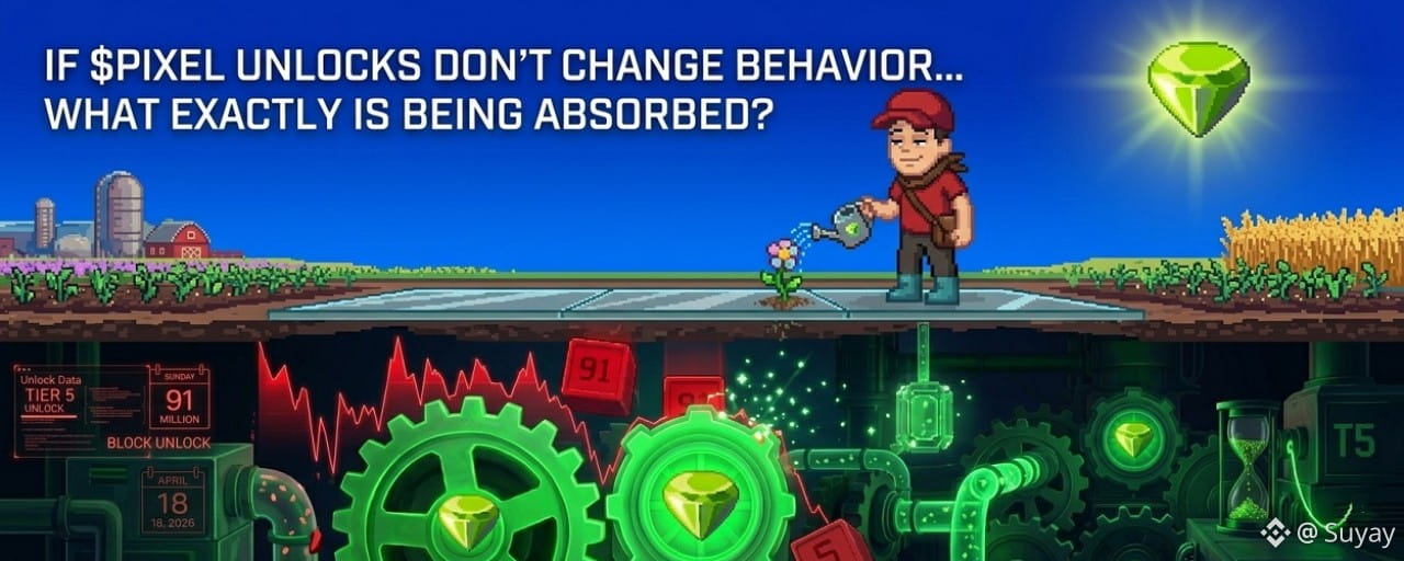 Usually, after an event like yesterday, especially when new $PIXEL enters circulation at that scale, there’s a period where behavior shifts. Players slow down, rethink what they’re doing, maybe become slightly more cautious without even noticing it. Not dramatically, just enough to feel that something changed. Here, that adjustment is hard to detect. The $PIXEL unlock happened, the price reacted, volume moved, and yet the experience inside Pixels continues almost uninterrupted.