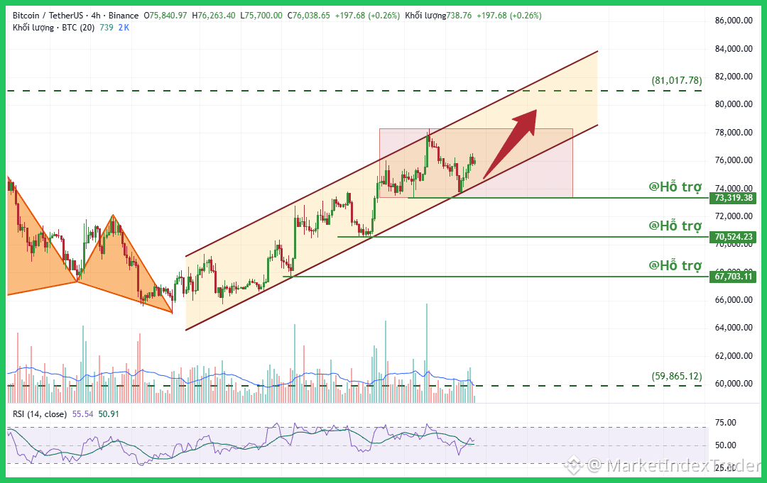 $BTC is currently locked in a textbook ascending channel on the 4-hour chart. After a period of healthy consolidation, price action has successfully retested and held the critical support zone at $73,319. Key support levels are firmly established at $73,319, $70,524, and $67,703. With the RSI sitting comfortably around 55, there is significant overhead room before we hit overbought territory. The path of least resistance is currently pointing toward the $81,017 resistance level at the top of the channel.
